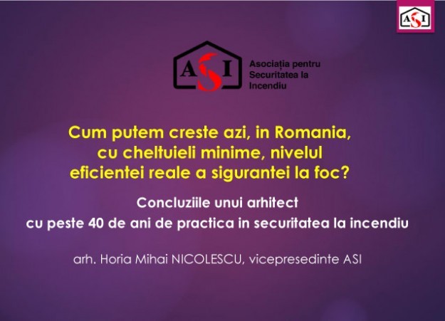 Prezentarea a reflectat concluziile unui arhitect cu peste 40 de ani de practica in securitatea la incendiu, adresate generatiilor mai tinere de arhitecti care se confrunta astazi cu nenumaratele probleme practice ale acestui domeniu din Romania.