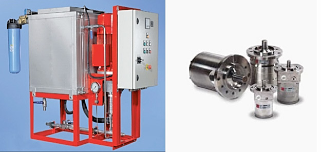 Deoarece functionarea sistemului se face la o presiune de 120-150 bar iar in in stand-by sistemul este presurizat la 10 bar, grupul de pompare, foarte compact, este compus din pompe cu tehnologie de ultima ora ce au unitate de pompare cu cilindru axial, agentul de racire si lubrifiere fiind chiar apa, si ca atare functionand fara ulei. Conform producatorului, grupul de pompare poate opera pana la 8000 ore fara mentenanta.